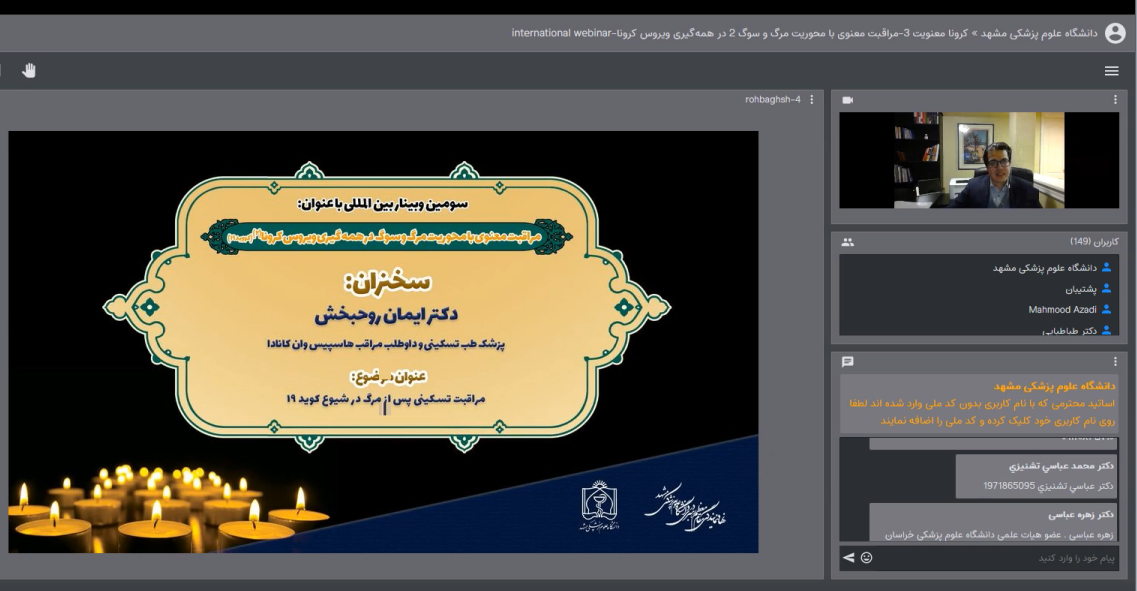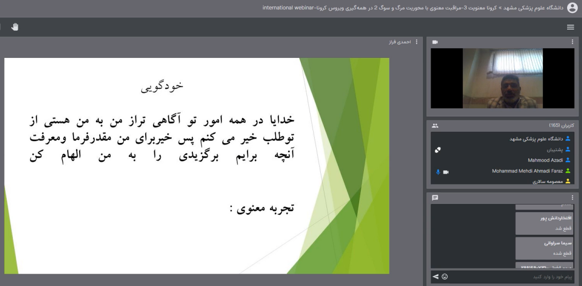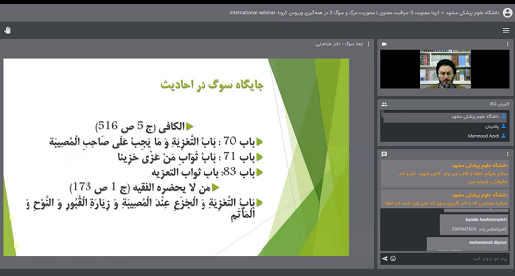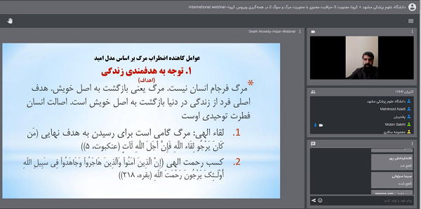 دفتر نهاد نمایندگی مقام معظم رهبری در دانشگاه علوم پزشکی مشهد برگزار کرد: سومین وبینار بین المللی "مراقبت معنوی با محوریت مرگ و سوگ در همهگیری کوید19" سومین وبینار میان رشته ای"مراقبت معنوی با محوریت مرگ و سوگ در همهگیری کووید19" پنجشنبه 30 بهمن ماه با حضور اساتید و صاحبنظرانی از داخل و خارج کشور برگزار شد. به گزارش روابط عمومی نهاد نمایندگی دانشگاه علوم پزشکی مشهد، در این وبینار 5 ساعته موضوعات مرتبط با بحث کرونا ویروس از جمله؛ " سنجش و درمان سوگ در عصر شیوع کرونا "، " ارتباط میان امید و اضطراب مرگ بر اساس منابع دینی" ، " مداخلهی معنوی شناختی جهت پذیرش سوگ یا آسیب دیدگان کوید19، مبتنی بر نیایش در مطالعات موردی" ، " مراقبت تسکینی پس از مرگ در شیوع کرونا" و " ابعاد مدیریت سوگ مبتنی بر قرآن و حدیث و ترس از مرگ و درمان آن مبتنی بر نظریه شناختی ابن سینا " مورد طرح و ارائه قرار گرفت.