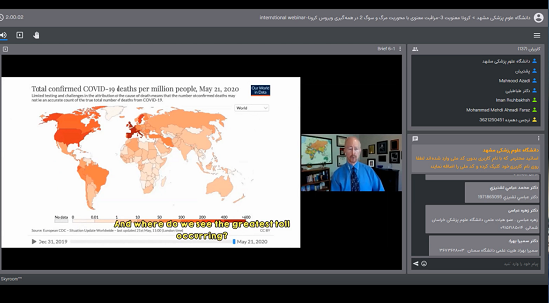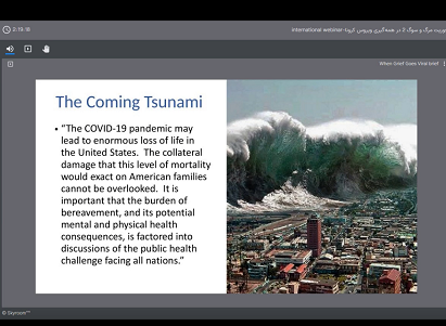 وی گسترش احساس ترس، اضطراب و احساس درماندگی عمومی و نیز بروز چالشهای اقتصادی، اجتماعی و خانوادگی را از پیامدهای مهم بیماری کرونا در سطح جهان دانست و افزود: این تأثیرات اکنون در قالب افزایش تنگناهای اقتصادی، فقر، سوء مصرف مشروبات الکلی و خشونت های خانگی ( که ناشی از قرنطینه شدن طولانی مدت خانواده هاست) نمایان شده و در صورت تداوم می تواند به یک سونامی پاندمیک که نابودکننده بخش زیادی از جامعه انسانی است، تبدیل شود. دکتر «رابرت نیمیر» در همین ارتباط افزود: عبارت «فاصله اجتماعی» که با هدف حفظ فاصله بدنی افراد از یکدیگر توصیه شده است به نظر می رسد که با بار معنایی منفی یا برداشتی اشتباه همراه بوده و سبب شده که بسیاری از افراد ارتباط خود را در اشکال دیگر آن نیز قطع کنند و این امر در درازمدت تاثیرات مخربی را بر بدنه اجتماعی جوامع خواهد داشت. این استاد و روانشناس آمریکایی همچنین توصیه کرد: در شرایط کنونی افراد نسبت به انجام فعالیتهای ورزشی آرامش بخش از جمله یوگا و حرکات نرمشی غفلت نکنند. در پایان این سخنرانی پروفسور نیمیر با معرفی برخی از کتابهای خود، همانند تکنیک های سوگ درمانی، برنامه خود را در این وبینار به پایان رساند. رسیدگی توأمان به جنبه های جسمی و روحی، در طب تسکینی دکتر ایمان روحبخش پزشک طب تسکینی و مراقب داوطلب در هاسپس وان کانادا هم در این وبینار، از هدف و فعالیتهای طب تسکینی در جهت کاهش فشار و استرس ناشی از بیماری، بر فرد بیمار، خانواده او و کادر درمان گفت و تاکید کرد: تلاش درمانگران طب تسکینی بر آن است که تمامی جنبه های روحی و جسمی فرد بیمار مورد توجه و رسیدگی قرار بگیرد و در مورد بیمارانی که امیدی به درمان و بهبود آنها نیست، زمینه یک مرگ خوب و مطابق با خواست بیمار فراهم شود. وی با اشاره به وضعیت بیماران کرونایی و شرایط بد آنها در هنگام مرگ گفت: عواملی در رابطه با این امر وجود دارد که مانع از تحقق یک مرگ خوب و رضایتبخش برای بیمار مبتلا به کوید و خانواده اش می شود؛ این عوامل عبارت است از 1. تنها ماندن بیمار کرونایی تا لحظه مرگ ( به دلیل خطر سرایت بیماری به همراهان بیمار، اغلب از ورود آنان به اتاق بیمار جلوگیری میشود و حتی در صورت انجام این کار امکان ارتباط جسمی و عاطفی مطلوب بین آنها محقق نخواهد شد) 2. مرگ ناگهانی فرد مبتلا به کوید که اغلب بدون زمینه های قبلی است و زمینه استرس و فشار روانی مضاعف بر بیمار و خانواده را فراهم می کند. 3.علائم ناشی از بیماری و بویژه علامت تنگی نفس در بیمار که به شدت آزاردهنده بوده و خانواده را مضطرب می سازد.